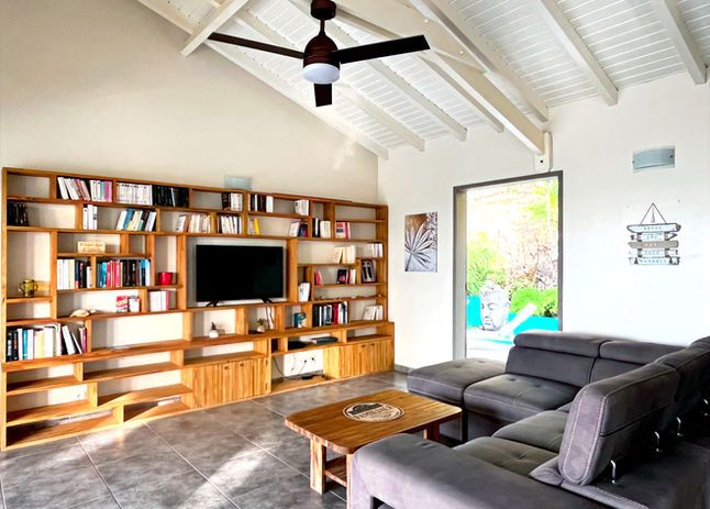 Vous pourrez ensuite accéder au salon, qui dispose d’une grande bibliothèque et d’une télévision.